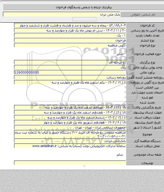 مناقصه عمومی دو مرحله ای خرید ۶۰۰ دستگاه حضور و غیاب به شماره ثبت ستاد ۲۰۰۳۰۰۱۰۵۶۰۰۰۰۲۱