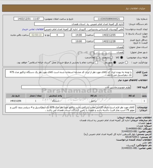 توضیحات خریدار:کالای مورد نظر لازم است دارای گارانتی معتبر شرکتی باشد تراکتور مورد نظر مدل 475 تک دیفرانسیل و 4 سیلندر بدون کابین و موتور 75 اسب بخار قدرت داشته باشد و اولویت با تامین کنندگان استان همدان می باشد .