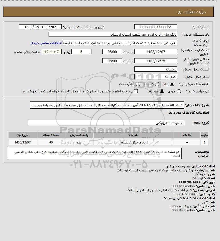 شرح کلی نیاز: تعداد 40 سلول باتری 65 یا 70 آمپر باکیفیت و گارانتی حداقل 3 ساله طبق مشخصات فنی وشرایط پیوست