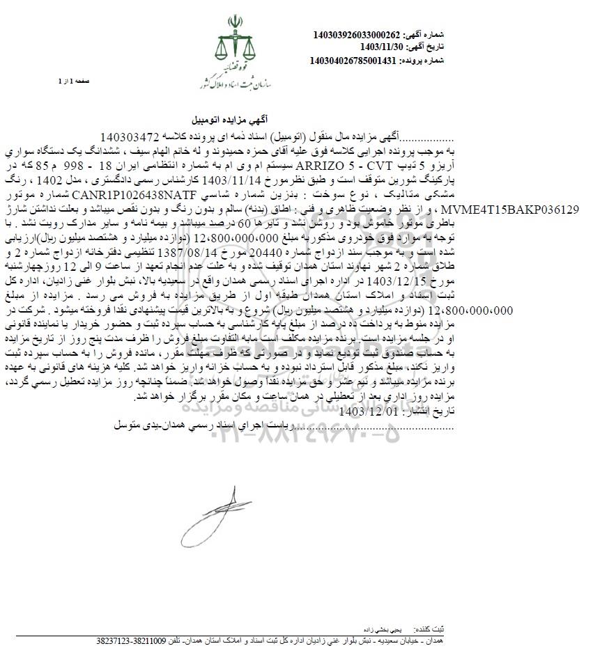 مزایده یک دستگاه سواری آریزو 5 تیپ ARRIZO 5- CVT سیستم ام وی ام مدل 1402 رنگ مشکی متالیک