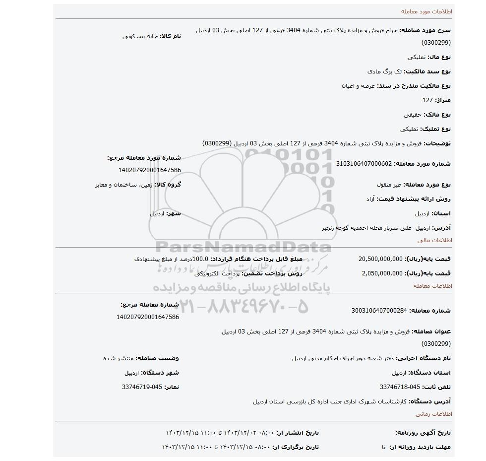 مزایده فروش و مزایده پلاک ثبتی شماره 3404 فرعی از 127 اصلی بخش 03 اردبیل (0300299), مزایده، فروش و مزایده پلاک ثبتی شماره 3404 فرعی از 127 اصلی بخش 03 اردبیل (0300299)
