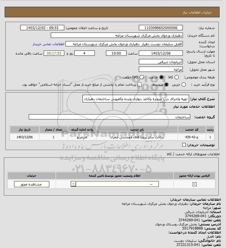 شرح کلی نیاز: تهیه واجرای درب وپنچره وکاغذ دیواری ونرده وکفپوش ساختمان دهیاری