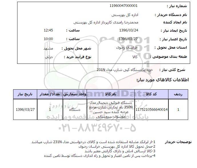 | 1 | 1175210566640014 | دستگاه فتوکپی دیجیتال مدل 350N نام تجارتی شارپ مرجع عرضه کننده سید حسین موسوی سروستانی |