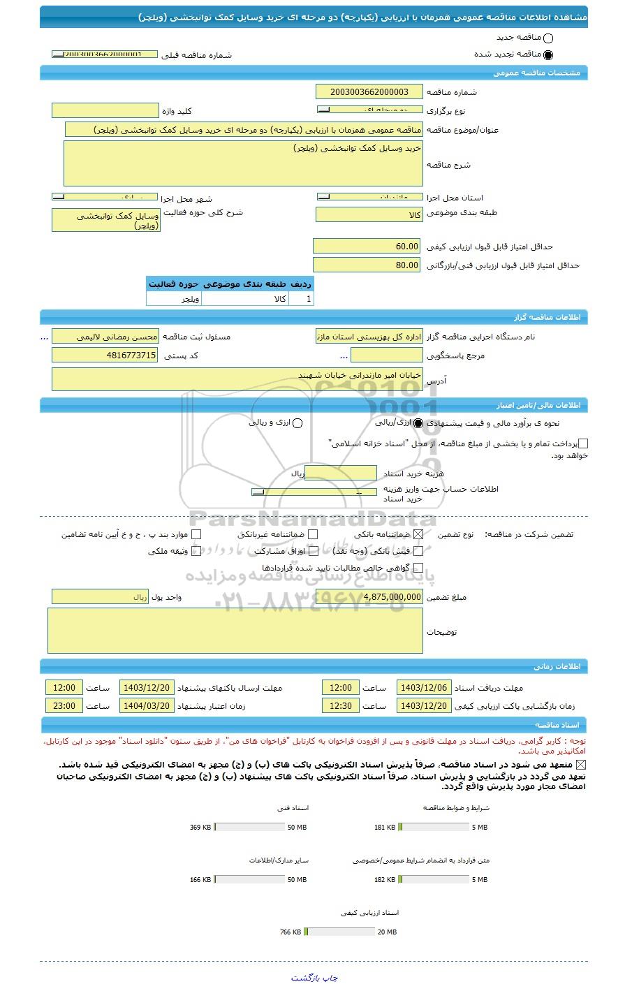 | زمان بازگشایی پاکت ها | 1403/12/20 | تا تاریخ | 12:30 | زمان اعتبار پیشنهاد | 1404/03/20 | تا ساعت | 23:00 |