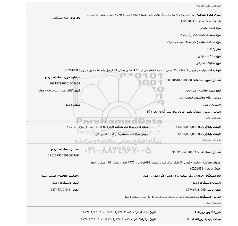 شرح مورد معامله: حراج مزایده و فروش 3 دانگ پلاک ثبتی شماره 492فرعی از 4770 اصلی بخش 01 اردبیل با حفظ حقوق مرتهن (0201831) | نام کالا: خانه مسکونی | |