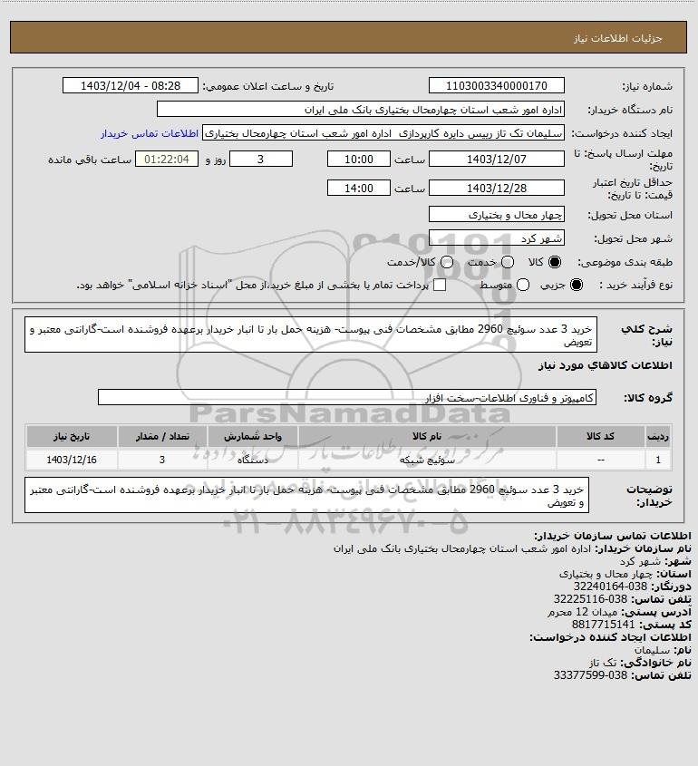 شرح کلی نیاز: خرید 3 عدد سوئیچ 2960 مطابق مشخصات فنی پیوست- هزینه حمل بار تا انبار خریدار برعهده فروشنده است-گارانتی معتبر و تعویض