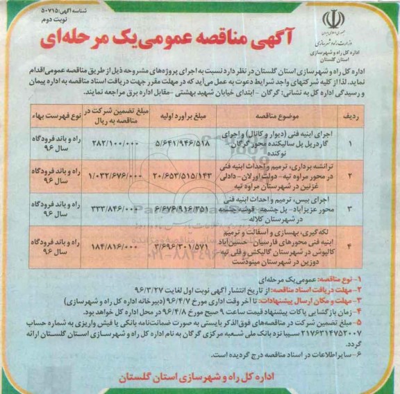 اداره کل راه و شهرسازی استان گلستان درنظردارد نسبت به اجرای پروژه های مشروحه ذیل از طریق مناقصه عمومی اقدام نماید. لذا از کلیه شرکتهای واجد شرایط دعوت به عمل می آید که در مهلت مقرر جهت دریافت اسناد مناقصه به اداره پیمان و رسیدگی اداره کل به نشانی گرگان، ابتدای خیابان شهید بهشتی مقابل اداره برق مراجعه نمایند