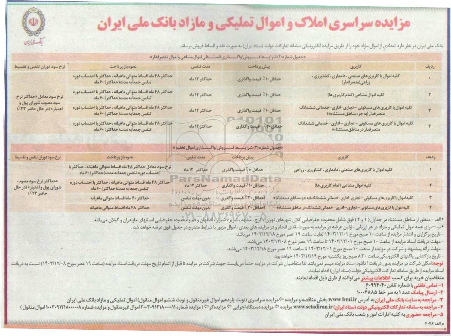 مزایده سراسری املاک و اموال تملیکی و مازاد بانک ملی ایران