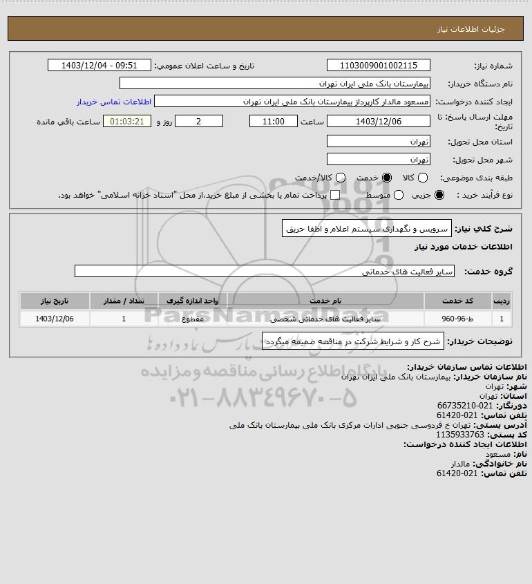 شرح کلی نیاز: سرویس و نگهداری سیستم اعلام و اطفا حریق