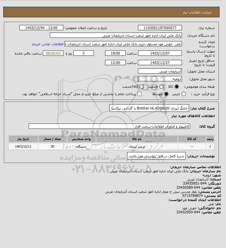 نام سازمان خریدار: بانک ملی ایران اداره امور شعب استان اذربایجان غربی