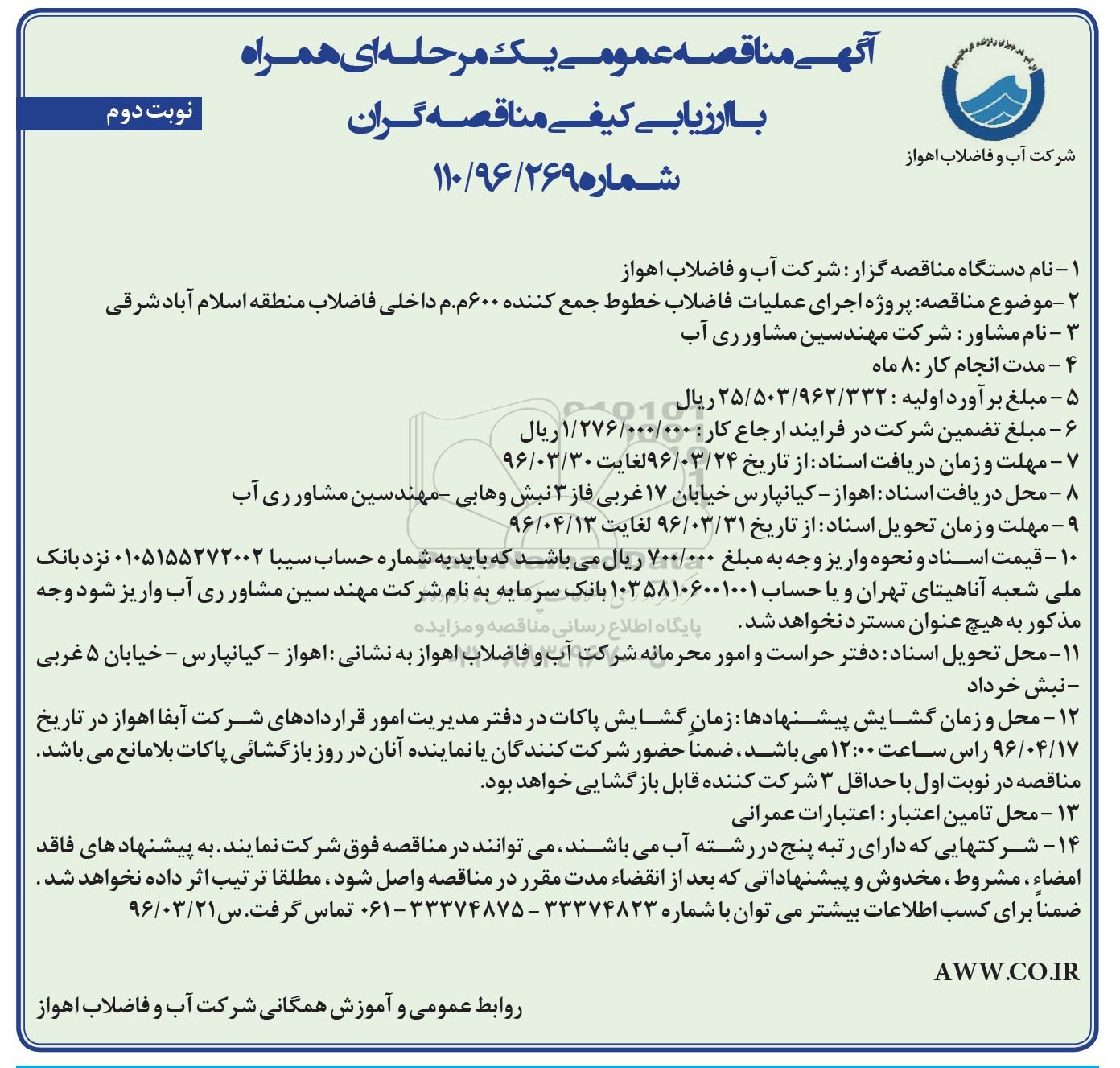 1- نام دستگاه مناقصه گزار: شرکت آب و فاضلاب اهواز