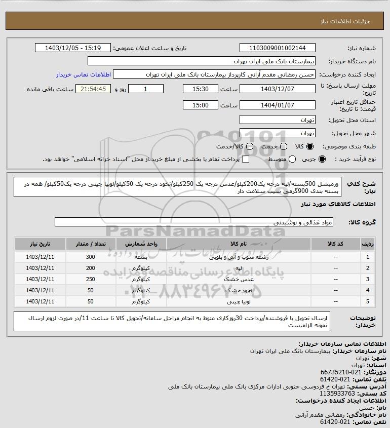 | 4 | -- | نخود خشک | کیلوگرم | 50 | 1403/12/11 |