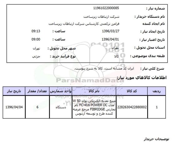 | 1 | 2282630422880002 | منبع تغذیه الکتریکی توان 50 وات مدل FC-416 POWER DC نام تجارتی FIBRIDGE مرجع عرضه کننده طرح و توسعه آرتنوس |