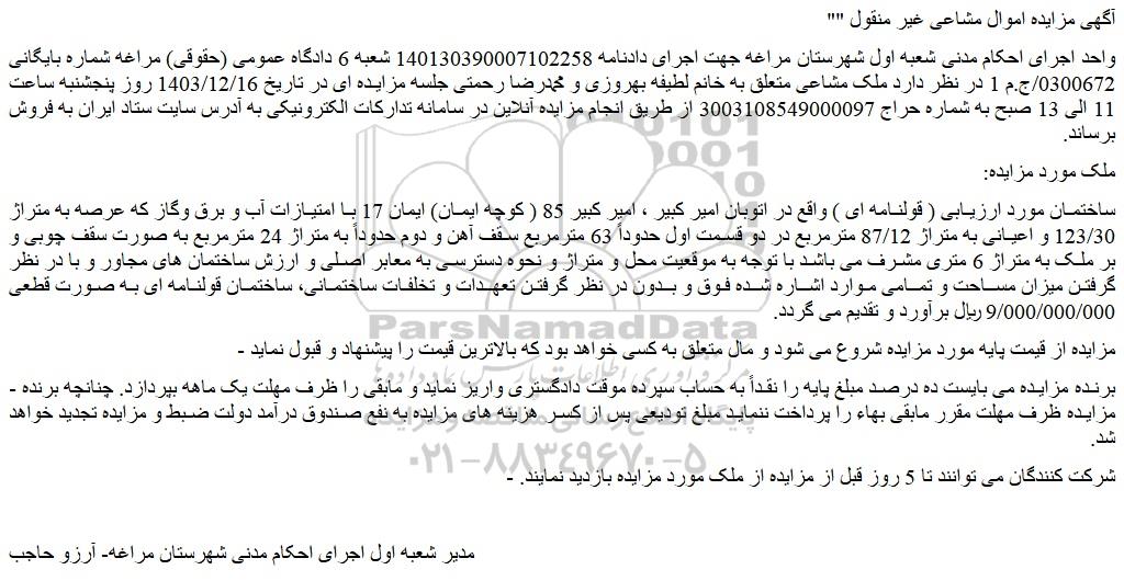 واحد اجرای احکام مدنی شعبه اول شهرستان مراغه جهت اجرای دادنامه 140130390007102258 شعبه 6 دادگاه عمومی (حقوقی) مراغه شماره بایگانی 0300672/ج.م 1 در نظر دارد ملک مشاعی متعلق به خانم لطیفه بهروزی و محمدرضا رحمتی جلسه مزایده ای در تاریخ 1403/12/16 روز پنجشنبه ساعت 11 الی 13 صبح به شماره حراج 3003108549000097 از طریق انجام مزایده آنلاین در سامانه تدارکات الکترونیکی به آدرس سایت ستاد ایران به فروش برساند.