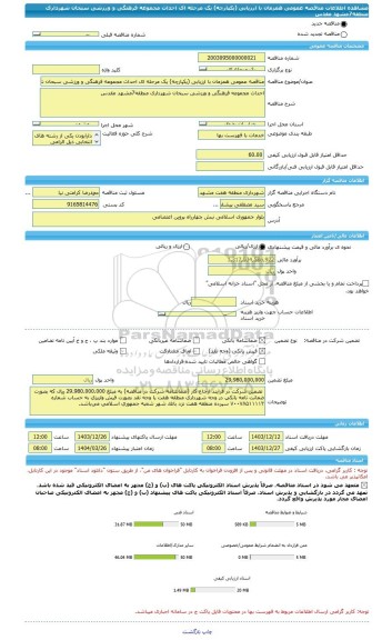 | شرح مناقصه | احداث مجموعه فرهنگی و ورزشی سبحان شهرداری منطقه7مشهد مقدس | ||