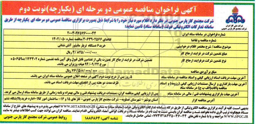 شرکت مجتمع گاز پارس جنوبی در نظر دارد اقلام مورد نیاز خود را با شرایط ذیل بصورت برگزاری مناقصه عمومی دو مرحله ای از طریق سامانه تدارکات الکترونیکی دولت (سامانه ستاد) تامین نماید