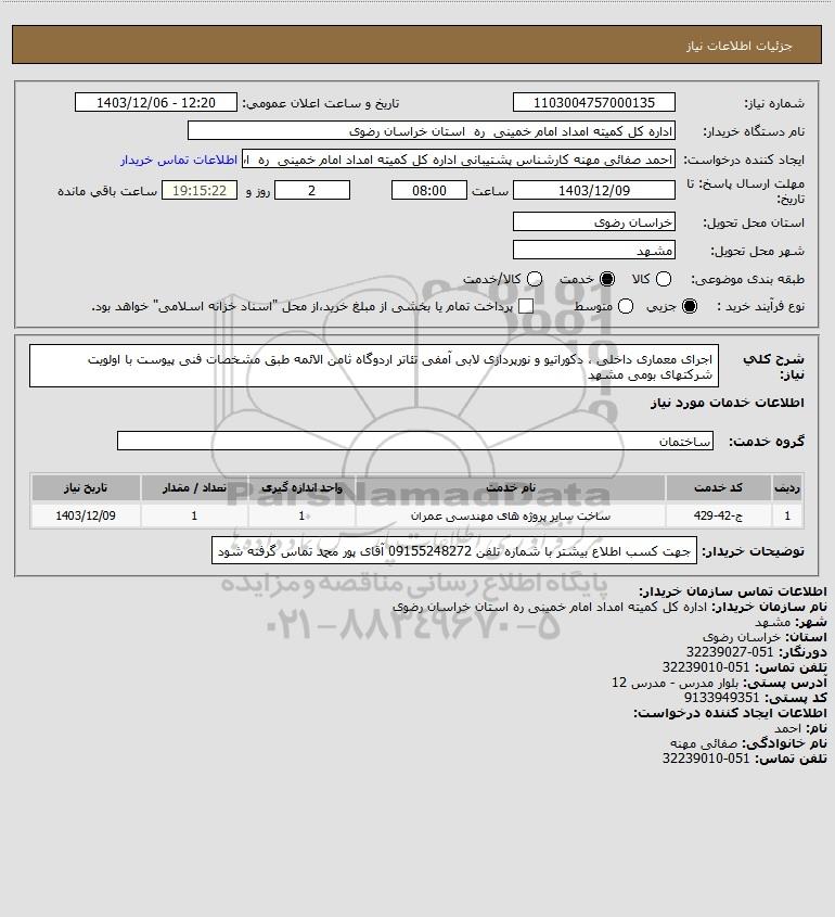 شرح کلی نیاز: اجرای معماری داخلی ، دکوراتیو و نورپردازی لابی آمفی تئاتر اردوگاه ثامن الائمه طبق مشخصات فنی پیوست با اولویت شرکتهای بومی مشهد