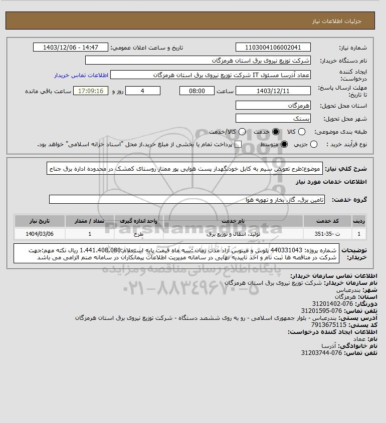 شرح کلی نیاز: موضوع:طرح تعویض سیم به کابل خودنگهدار پست هوایی پور ممتاز روستای کمشک در محدوده اداره برق جناح