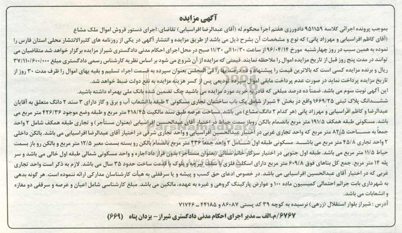مزایده ششدانگ پلاک ثبتی 1669.25 بخش 4 شیراز کلاسه 951159