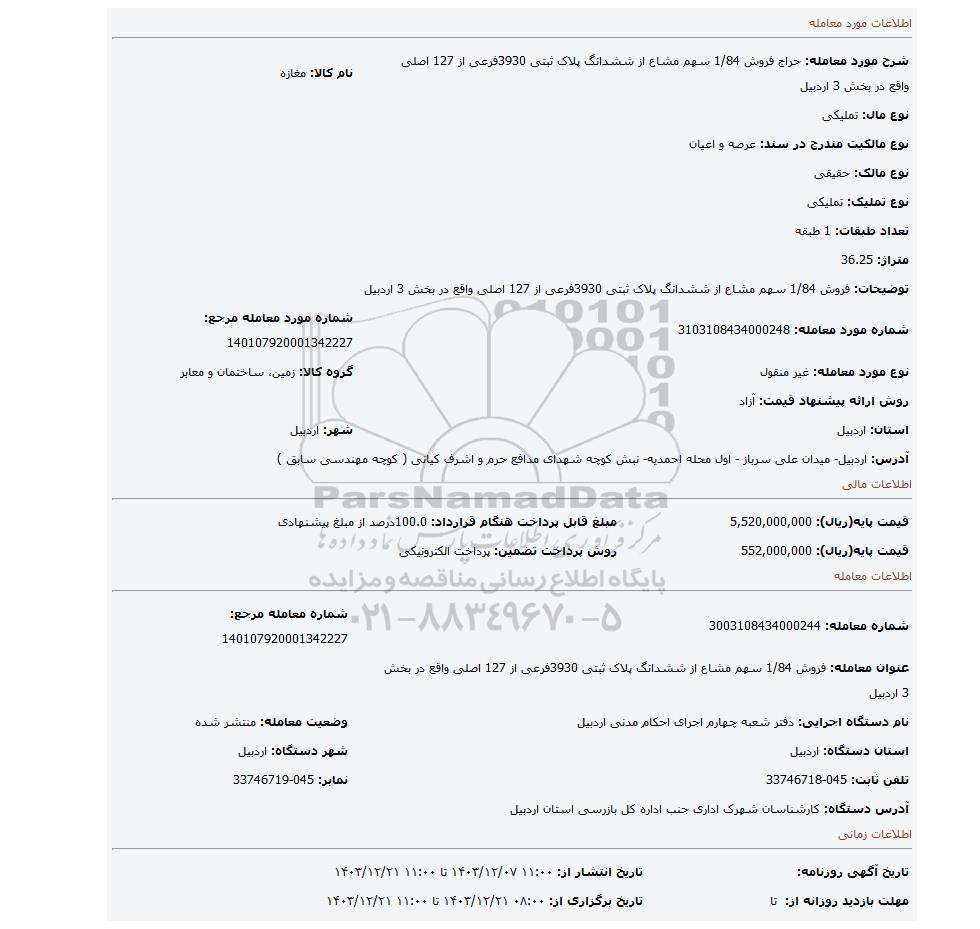 عنوان معامله: فروش 1/84 سهم مشاع از ششدانگ پلاک ثبتی 3930فرعی از 127 اصلی واقع در بخش 3 اردبیل | ||