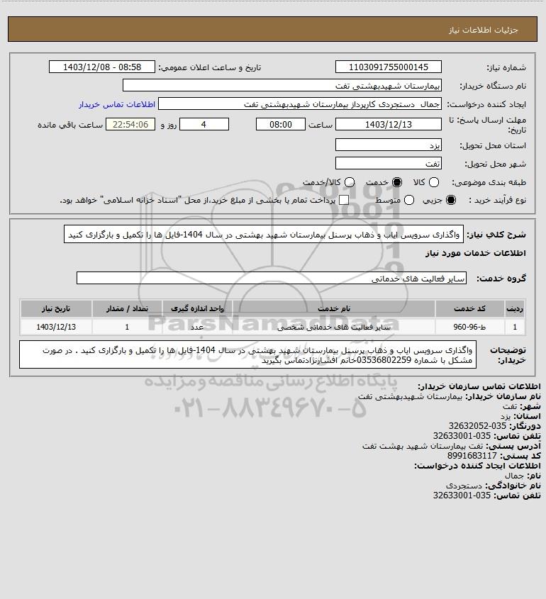 توضیحات خریدار:واگذاری سرویس ایاب و ذهاب پرسنل بیمارستان شهید بهشتی در سال 1404-فایل ها را تکمیل و بارگزاری کنید . در صورت