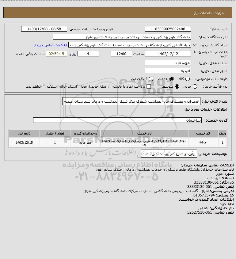 استعلام تعمیرات و بهسازی خانه بهداشت شهرک بلال شبکه بهداشت و درمان شهرستان امیدیه, استعلام تعمیرات و بهسازی خانه بهداشت شهرک بلال شبکه بهداشت و درمان شهرستان امیدیه