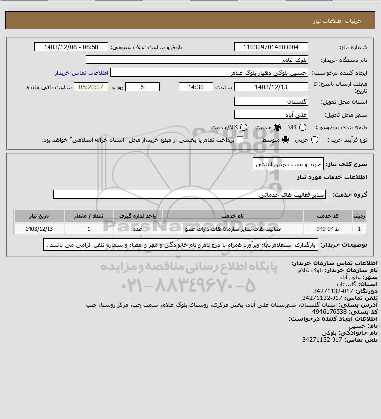 استعلام بها و موضوع استعلام استعلام خرید و نصب دوربین امنیتی به اطلاع کلیه شرکت‌ها و افراد متخصص واجد شرایط می‌رساند، آگهی گذار در نظر دارد از طریق استعلام بها، نسبت به انتخاب و دریافت پیشنهادات اقدام نماید. این استعلام با کد آگهی ثبت شده در سامانه خبرگزاری پارس نماد : 8731635 منتشر شده است. مشخصات استعلام : تاریخ شروع استعلام: 1403/12/08 آخرین مهلت ارسال پیشنهاد قیمت : 1403/12/13 و محل اجرای پروژه : استان گلستان میباشد. استعلام قیمت مورد درخواست : استعلام خرید و نصب دوربین امنیتی با دسته‌بندی‌های تخصصی و گروه های مرتبط : سیستم های حفاظتی-دوربین مدار بسته،دزدگیر،آیفون تصویری و آنتن مرکزی, استعلام اطلاع رسانی میگردد.