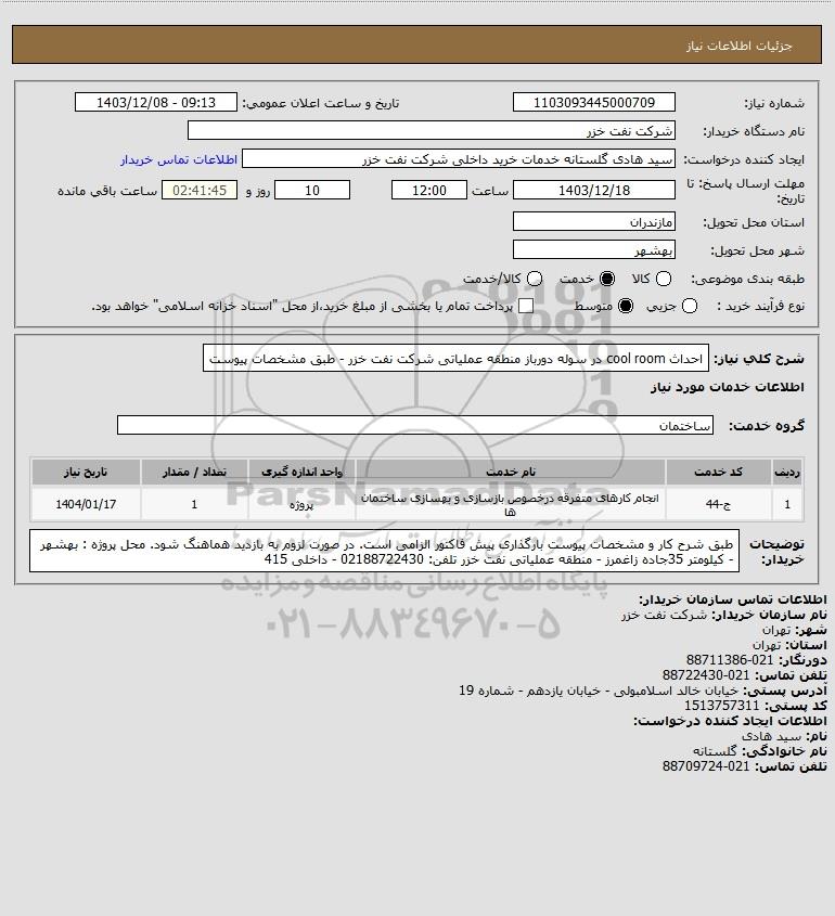 شرح کلی نیاز: احداث cool room در سوله دورباز منطقه عملیاتی شرکت نفت خزر - طبق مشخصات پیوست