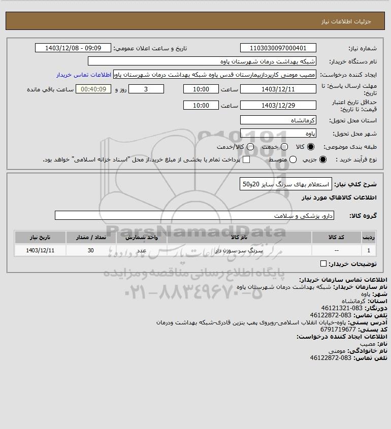 شرح کلی نیاز: استعلام بهای سرنگ سایز 20و50