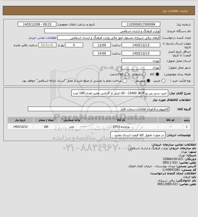 شرح کلی نیاز: خرید سی پی یو ci5 - 12400 -BOX اینتل با گارانتی معتبر تعداد 180 عدد