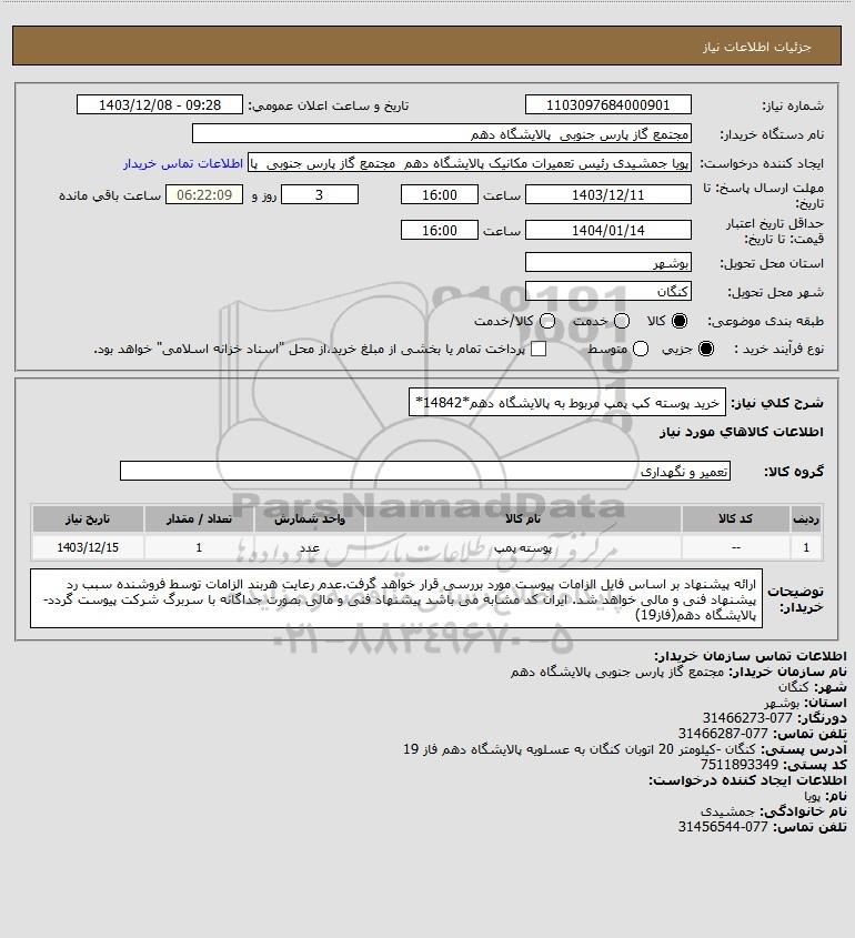شرح کلی نیاز: خرید پوسته کپ پمپ مربوط به پالایشگاه دهم*14842*