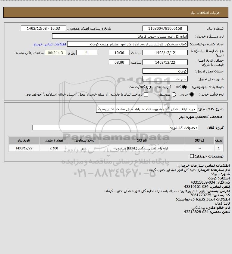 شرح کلی نیاز: خرید لوله عشایر گازئو شهرستان عنبرآباد طبق مشخصات پیوست