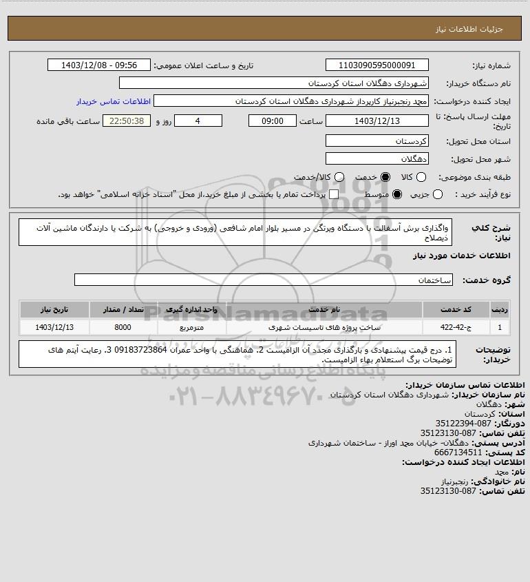 نام دستگاه خریدار:شهرداری دهگلان استان کردستان