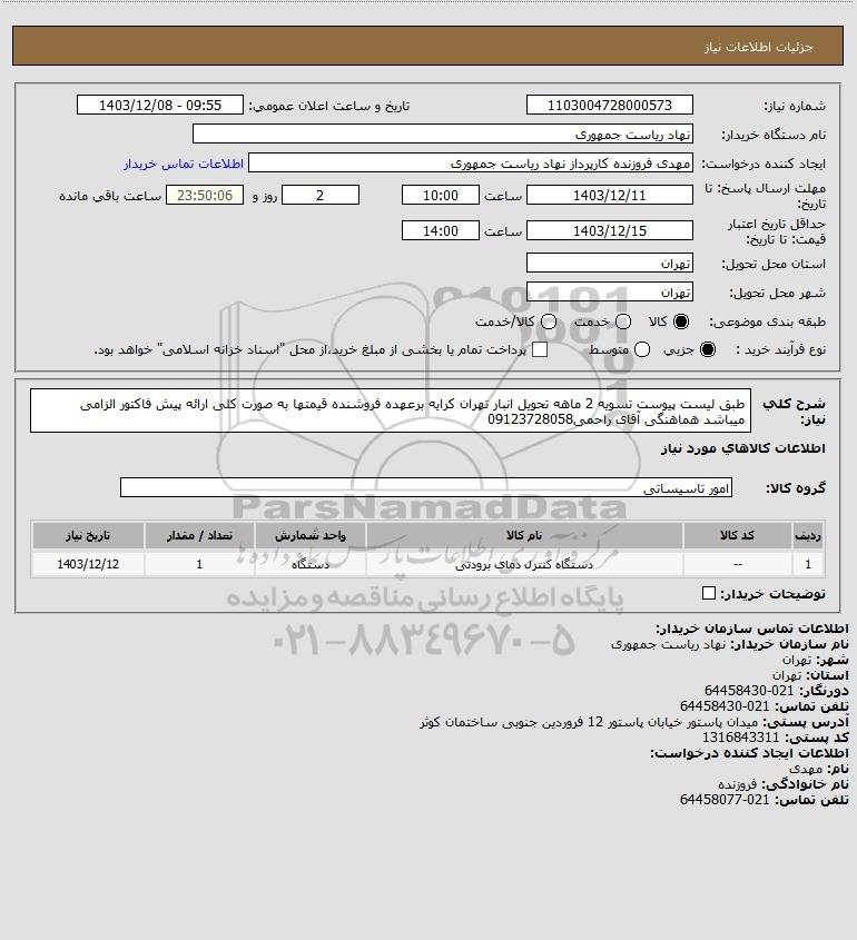 | 1 | -- | دستگاه کنترل دمای برودتی | دستگاه | 1 | 1403/12/12 |
