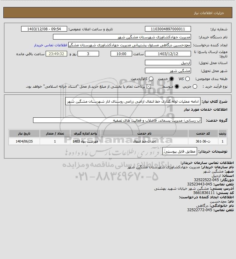 شرح کلی نیاز: ادامه عملیات لوله گذاری خط انتقال اراضی زراعی روستای انار شهرستان مشگین شهر