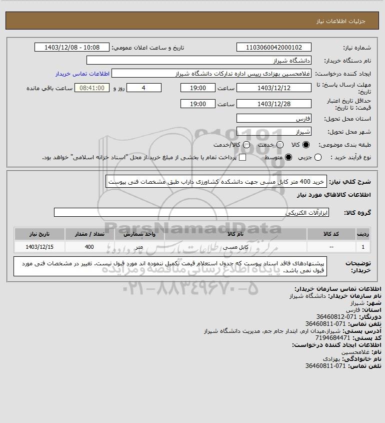 شرح کلی نیاز: خرید 400 متر کابل مسی جهت دانشکده کشاورزی داراب طبق مشخصات فنی پیوست