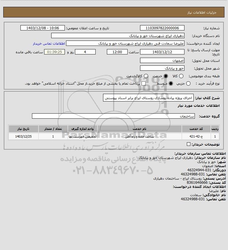 شرح کلی نیاز: اجرای پروژه پیاده روسازی روستای ایراج برابر اسناد پیوستی