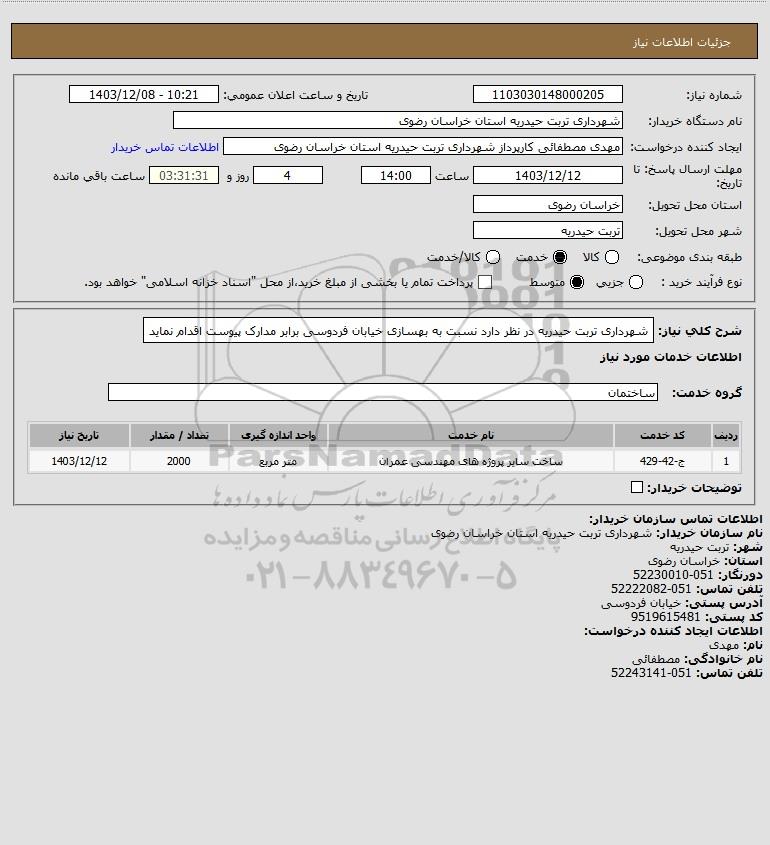 شرح کلی نیاز: شهرداری تربت حیدریه در نظر دارد نسبت به بهسازی خیابان فردوسی برابر مدارک پیوست اقدام نماید