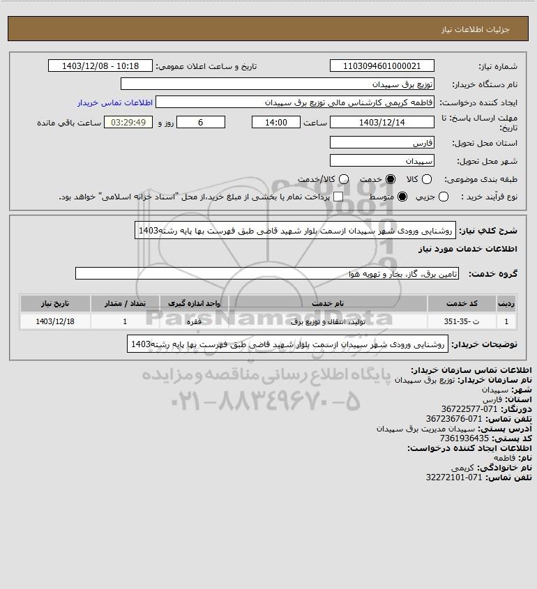 شرح کلی نیاز: روشنایی ورودی شهر سپیدان ازسمت بلوار شهید قاضی طبق فهرست بها پایه رشته1403