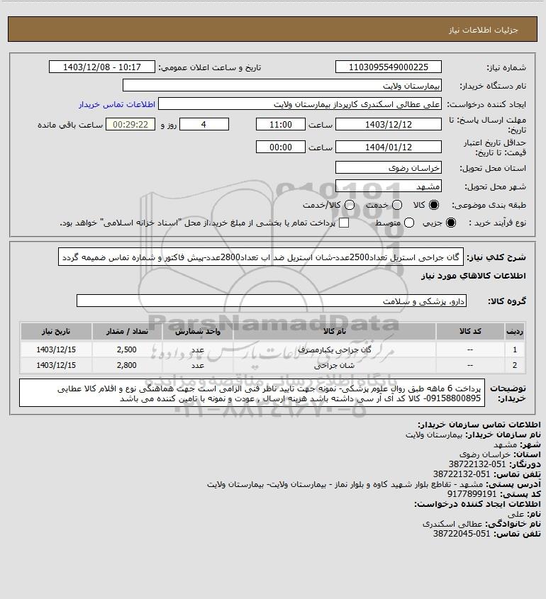 شرح کلی نیاز: گان جراحی استریل تعداد2500عدد-شان استریل ضد اب تعداد2800عدد-پیش فاکتور و شماره تماس ضمیمه گردد
