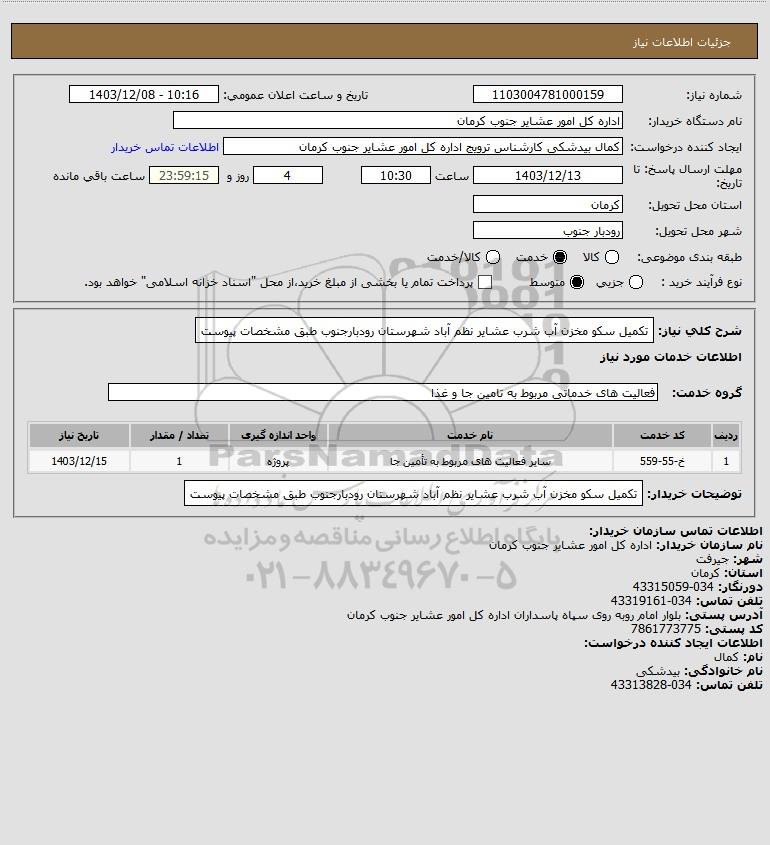 شرح کلی نیاز: تکمیل سکو مخزن آب شرب عشایر نظم آباد شهرستان رودبارجنوب طبق مشخصات پیوست