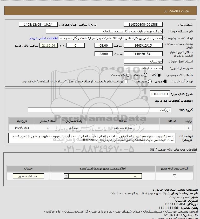 | 1 | -- | پیچ دو سر رزوه | کیلوگرم | 1 | 1404/01/31 |