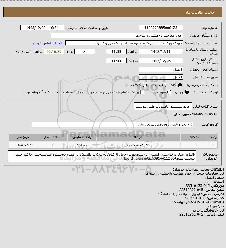 شرح کلی نیاز: خرید سیستم کامپیوتری طبق پیوست