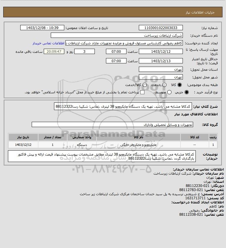 شرح کلی نیاز: کدکالا مشابه می باشد. تهیه یک دستگاه مایکروویو 38 لیتری .تماس: شکیبا رسا88112322