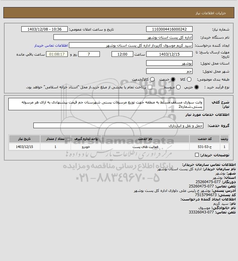شرح کلی نیاز: وانت سواری مسقف مسلط به منطقه جهت توزیع مرسولات پستی شهرستان جم قیمت پیشنهادی به ازای هر مرسوله پستی.شماره2