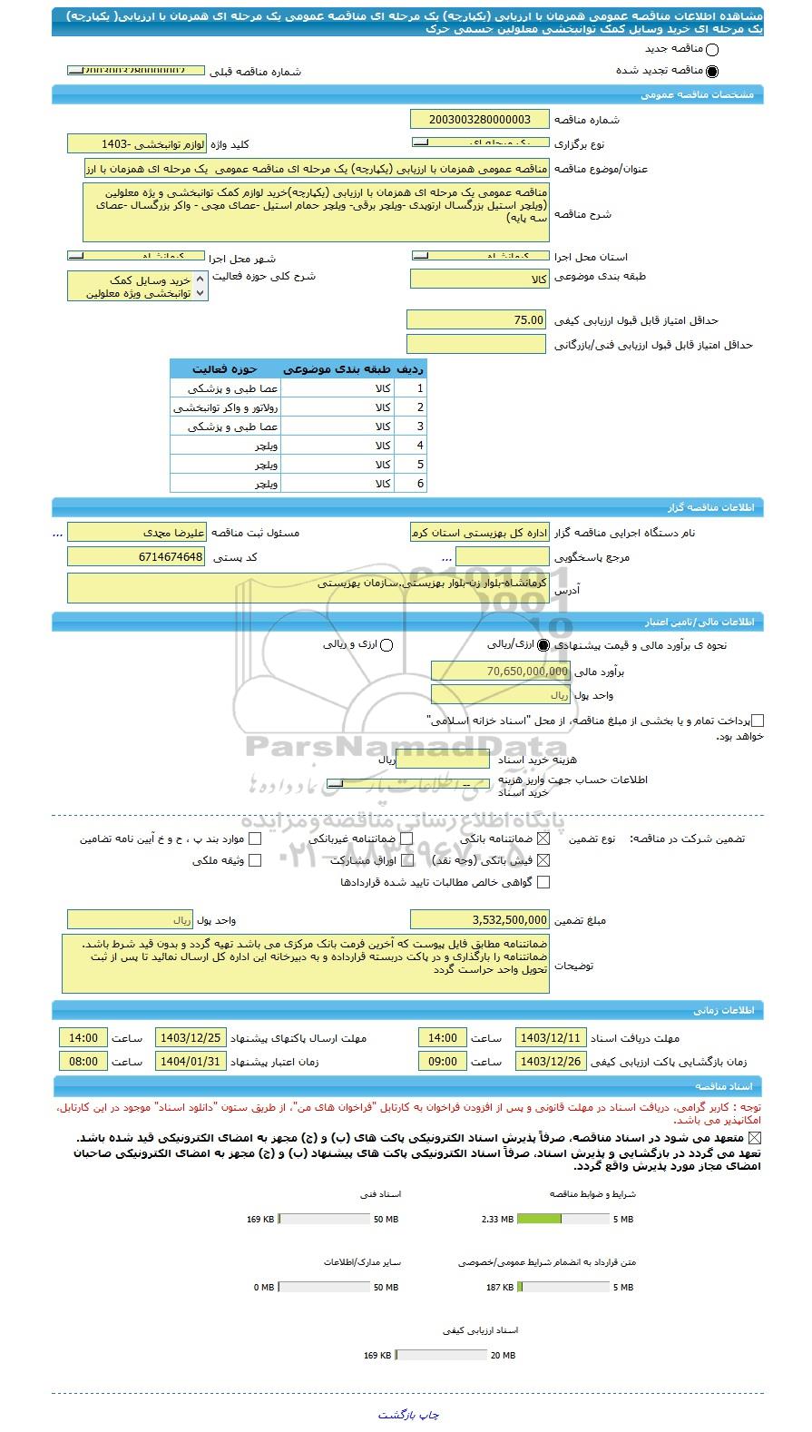 | زمان بازگشایی پاکت ها | 1403/12/26 | تا تاریخ | 09:00 | زمان اعتبار پیشنهاد | 1404/01/31 | تا ساعت | 08:00 |