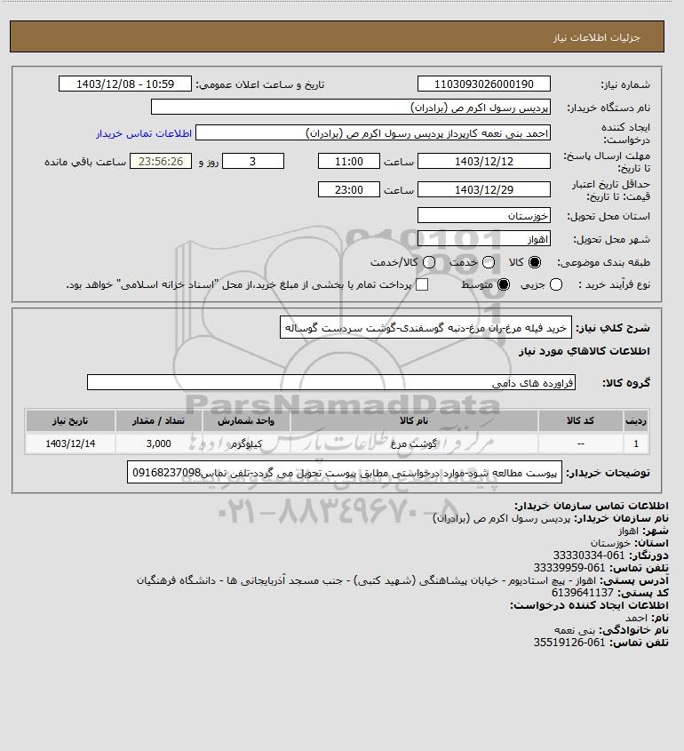 | 1 | -- | گوشت مرغ | کیلوگرم | 3,000 | 1403/12/14 |
