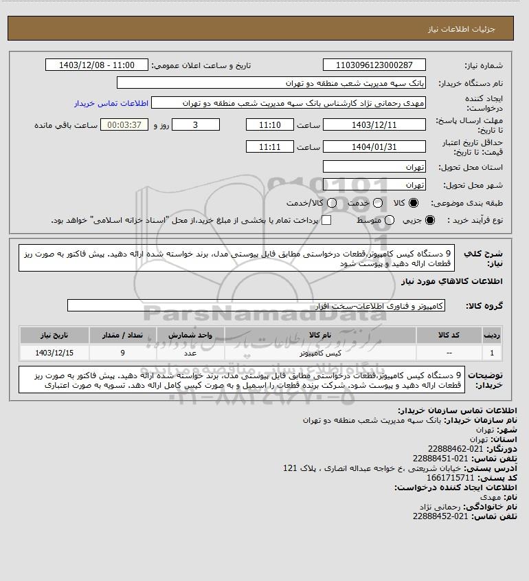 نام دستگاه خریدار:بانک سپه مدیریت شعب منطقه دو تهران