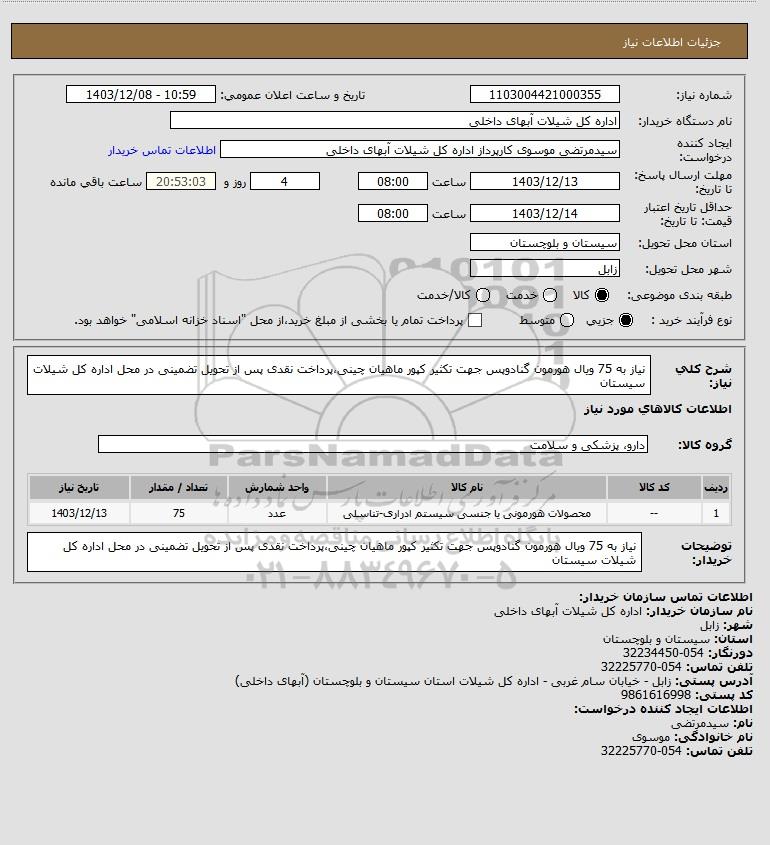 شرح کلی نیاز: نیاز به 75 ویال هورمون گنادوپس جهت تکثیر کپور ماهیان چینی،پرداخت نقدی پس از تحویل تضمینی در محل اداره کل شیلات سیستان