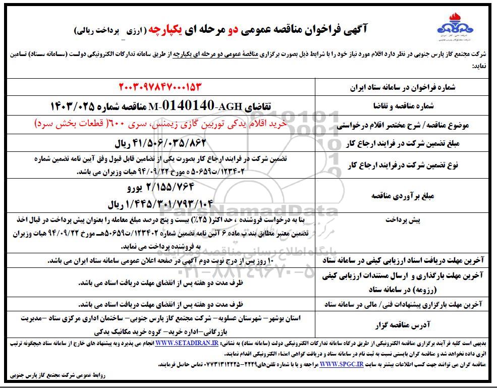 شرکت مجتمع گاز پارس جنوبی در نظر دارد اقلام مورد نیاز خود را با شرایط ذیل بصورت برگزاری مناقصه عمومی همزمان با ارزیابی کیفی یکپارچه دو مرحله ای از طریق سامانه تدارکات الکترونیکی دولت سامانه ستاد تامین نماید